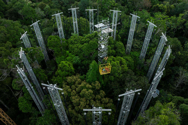 Фотограф Лало де Алмейда (Lalo de Almeida) сделал эти снимки в рамках эксперимента по обогащению углекислого газа в атмосфере Амазонки (AmazonFACE), проекта, который проводится Национальным институтом амазонских исследований в 80 километрах к северу от бразильского города Манаус. Он сравнил это со “скрытым шпионским сооружением из фильма о Бонде”.