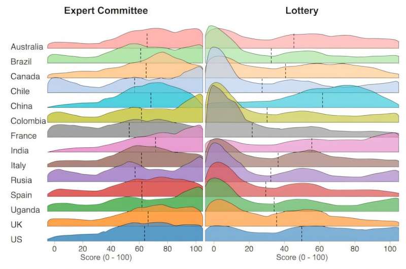 В среднем экспертные комиссии набрали 61 балл, по сравнению с 37 для лотерей. Хотя распределение экспертов было более приемлемым во всех странах, поддержка лотерей резко различалась по странам — от поразительно низкой во Франции и Чили до относительно высокой в Китае, Индии и США.
