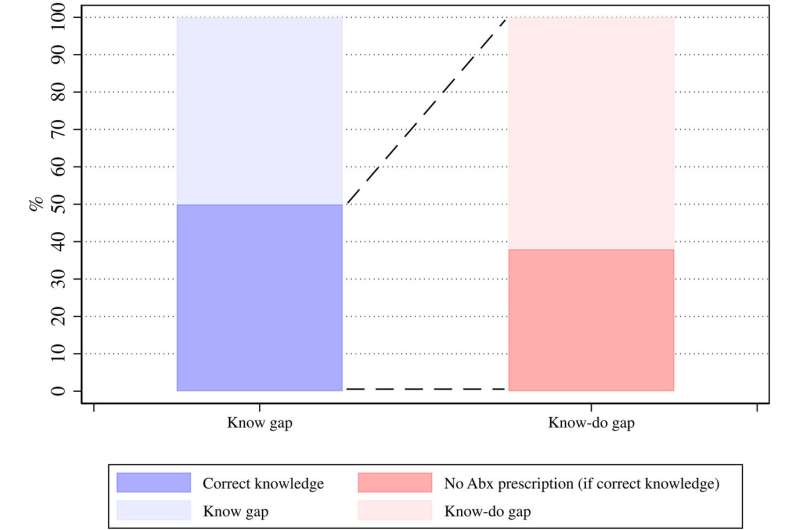 В выборке из 2282 частных врачей в 253 городах 70% назначали антибиотики без признаков бактериальной инфекции, а среди тех, кто знал, что антибиотики не подходят, 62% все равно назначали их стандартизированным пациентам, что указывает на большой пробел в знаниях и практике. Исследование показало, что устранение пробела в знаниях само по себе сократило бы ненадлежащее использование антибиотиков примерно на 6 процентных пунктов, в то время как устранение пробела в знаниях могло бы сократить его примерно на 30 процентных пунктов.