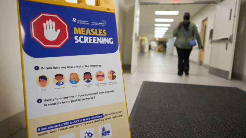 Человек проходит мимо таблички с надписью «Обследование на корь» в больнице Виктория в Лондоне, провинция Онтарио. Канада ликвидировала корь в 1998 году, но первая годовщина вспышки, которая началась в конце 2024 года, ознаменовалась потерей страной статуса страны, ликвидировавшей корь.