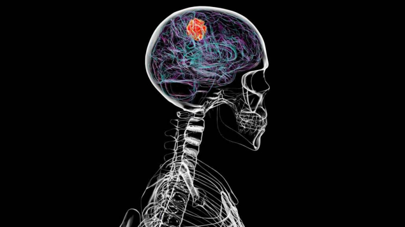 Тип рака головного мозга, называемый глиобластомой, показанный на этой иллюстрации, может привести к истончению костей черепа у мышей и людей.